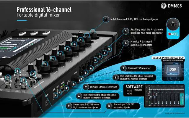 DM-1608 has powerful processing power and advanced features for the convenience and speed of the software operating process designed to bring up the mixing interface quickly. A convenient and fast operating experience that allows everyone to enjoy the convenience and power of a digital mixer.