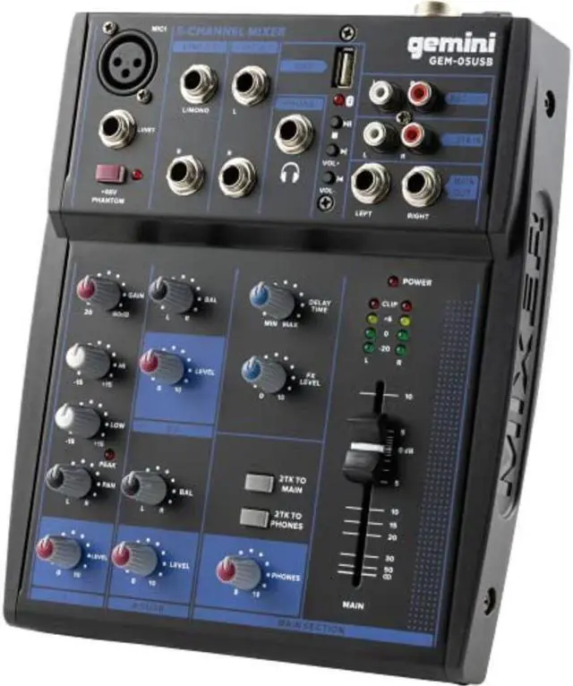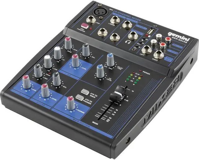 Gemini Sound GEM-05USB - 5-Channel Bluetooth Audio Mixer, USB Playback, Compact DJ Mixer Console with Phantom Power, 2-Band EQ, and FX Control