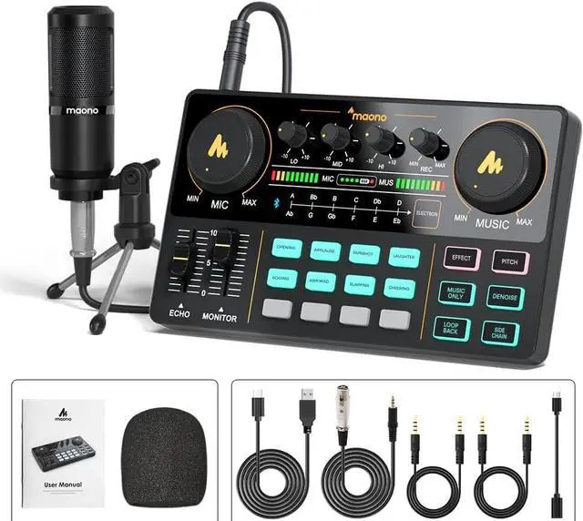 BORN FOR LIVE STREAMING: MAONO podcast equipment soundboard supports up to 2 people, 4 devices, and 4 platforms to stream simultaneously. Highlights of this set, you can change your voice to the male, female, or girlish, robot. With two mic inputs, One Accompaniment input, and real-time monitoring, good noise reduction effect after pressing the DENOISE button. It is compatible with IOS and Android systems.