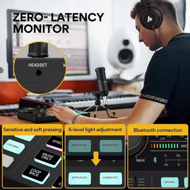 SPECIAL EFFECTS: Four user recordable, eight Built-in special audio effects, and various adjustments available for your creation. Fixed audio effects like APPLAUSE, LAUGHTER, CHEERING... Note please record your own audio effects you like to audio mixer according to the instructions.