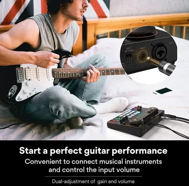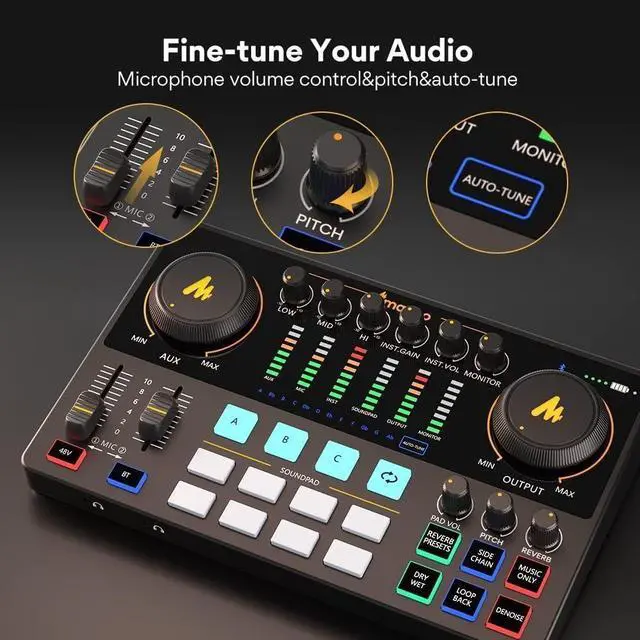 [Enjoy a Personalized Podcasting Atmosphere]: The audio interface mixer has six reverb modes that you can adjust freely, 12-step auto-tune, 3 modifiable tones (Treble, mid-range, bass), and pitch changer knobs. Each microphone input is independently controlled, and pro features like sidechain, music-only, and loopback switches are included