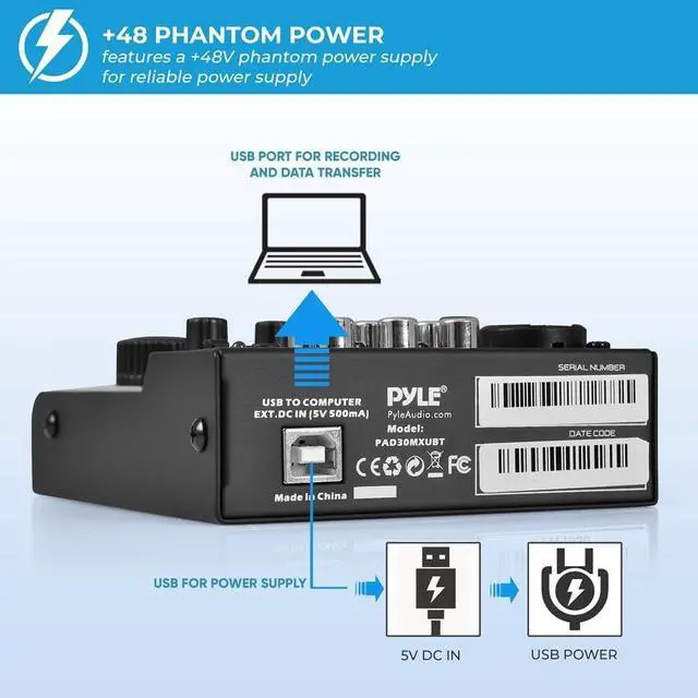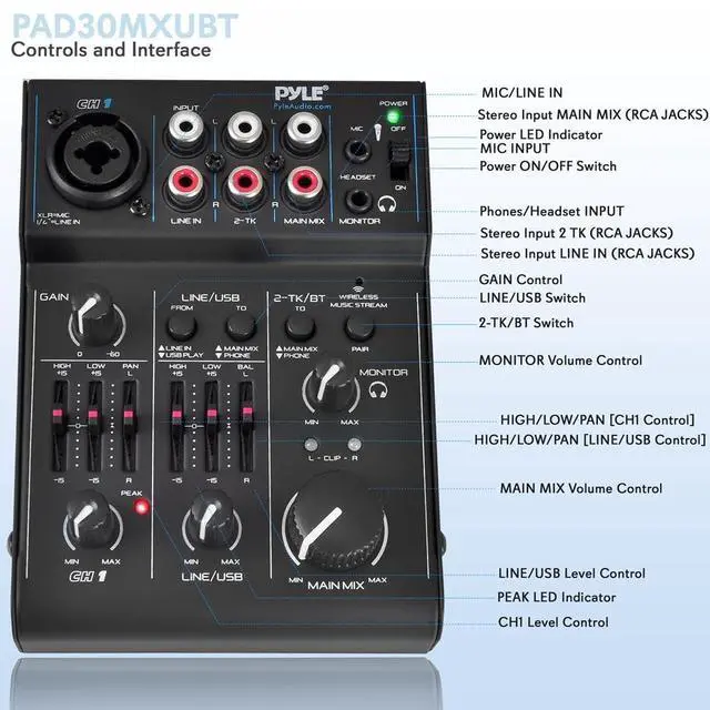 This personal mixer has a USB soundcard and audio interface to record and connect to MAC or PC and it has universal digital audio file compatibility. Can be used by beginners or studio professional applications. For reliable power source, this DJ mixer comes with an 18V Phantom 3mV/12KO (Gain Max) and Line Ch2 and Ch3 has 150mV/22KO power supply. Includes USB wall adapter power supply and connection cable.The Line Ch1 has