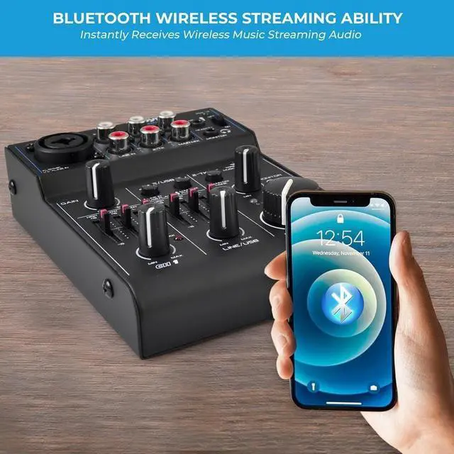 This portable 3 channel DJ sound controller has V3.0 Bluetooth for wireless streaming ability. It works with iPhone, Android, iPad, Tablet, MP3 Player and other devices. The wireless range is 50 ft