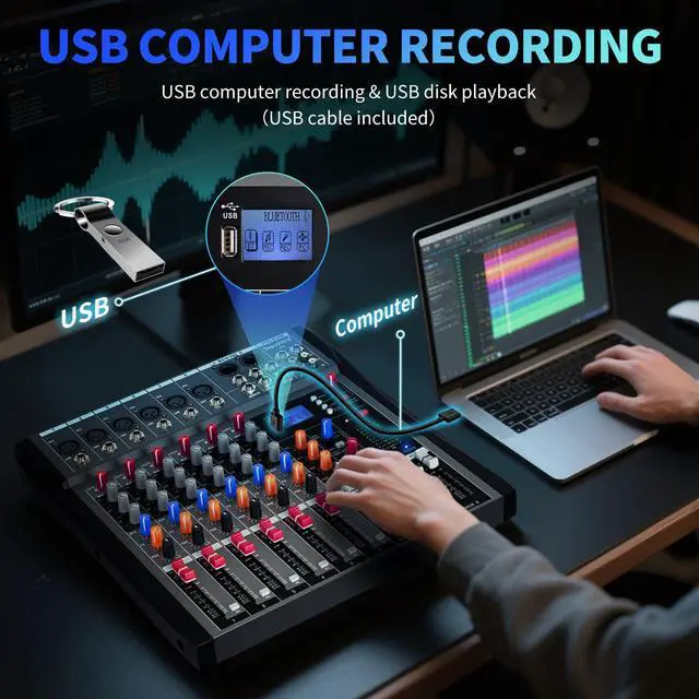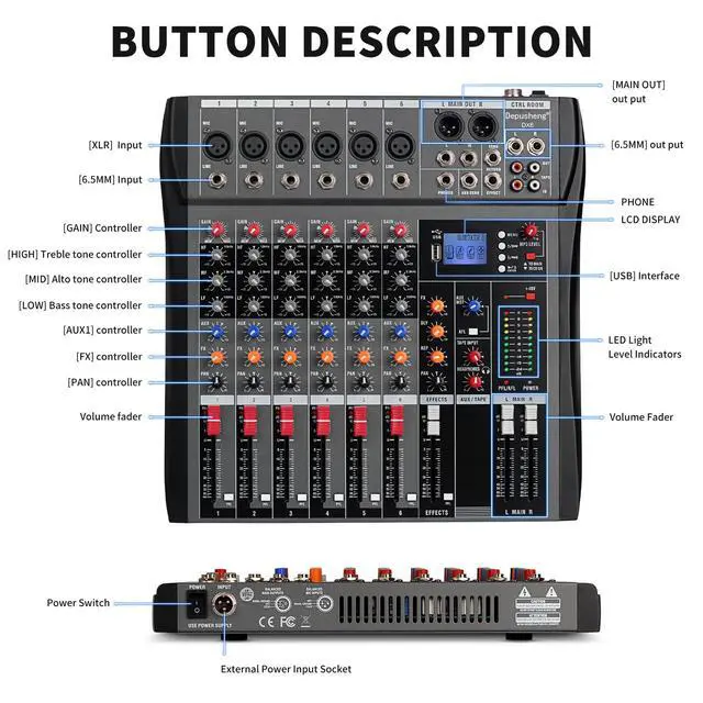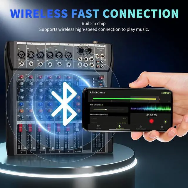 Built-in + 48V phantom power, reverb effect. HD headphone output port, MP3 player, Bluetooth connection playback. USB - computer recording and sound editing function. Support SD/TF card, etc.