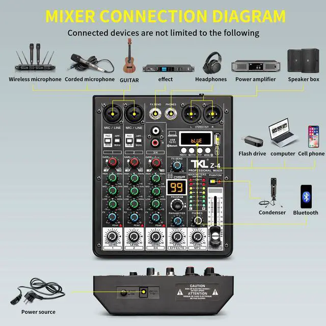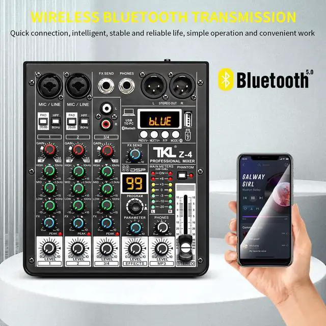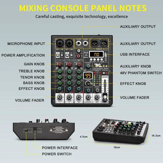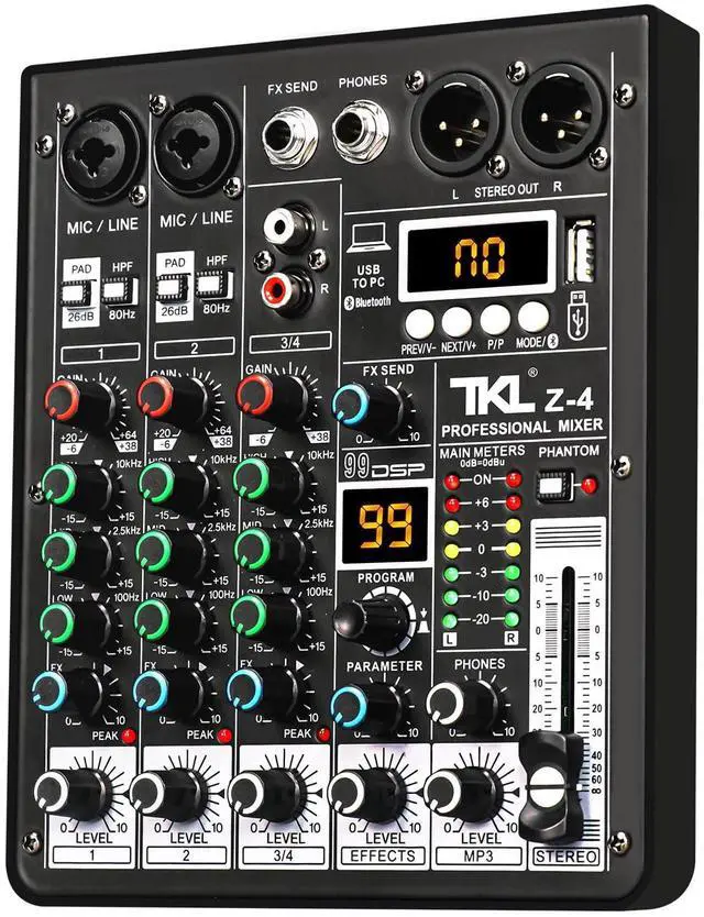 Equipped with advanced chip technology to enhance performance and ensure stable sound output. It features 2 XLR line input jacks for connecting microphones, along with a 3-band EQ adjustment for precise audio control. Additionally, it offers two stereo line inputs for versatile audio connectivity