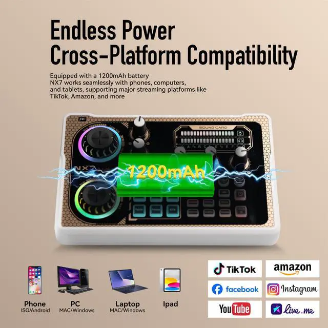 Long Battery Life & Broad Compatibility Built-in 1200mAh battery offers extended usage time. Compatible with phones, tablets, and PCs, supporting a wide range of recording and broadcasting applications.