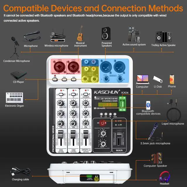 KX04 is powered professional mixers and do not include a built-in amplifier. Passive speakers require an external power amp. Active (powered) speakers can be connected directly.