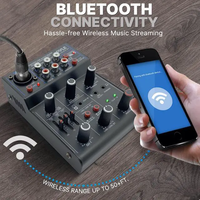 This sound mixer USB interface mixer is compatible w/ bluetooth and works w/ smartphone, tablet, laptop, pc w/ simple hassle-free pairing. Wirelessly stream music like Pandora / Spotify from your device directly to your mix