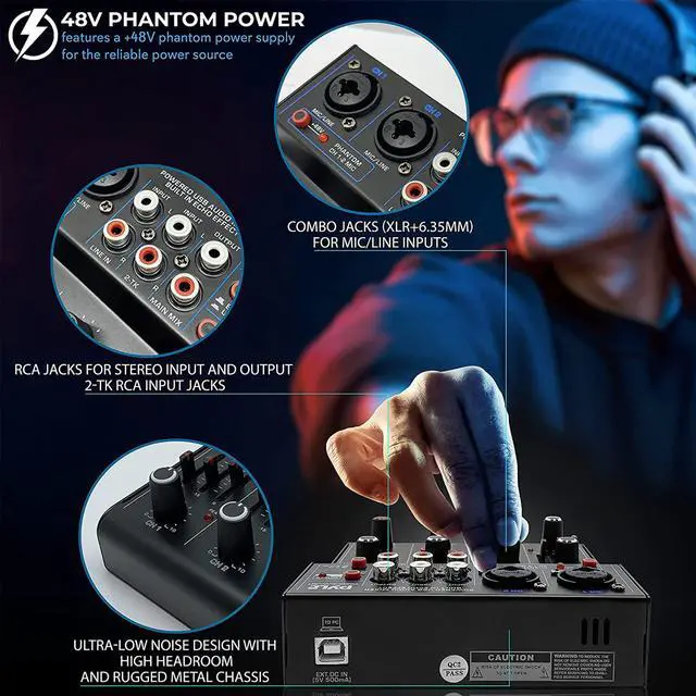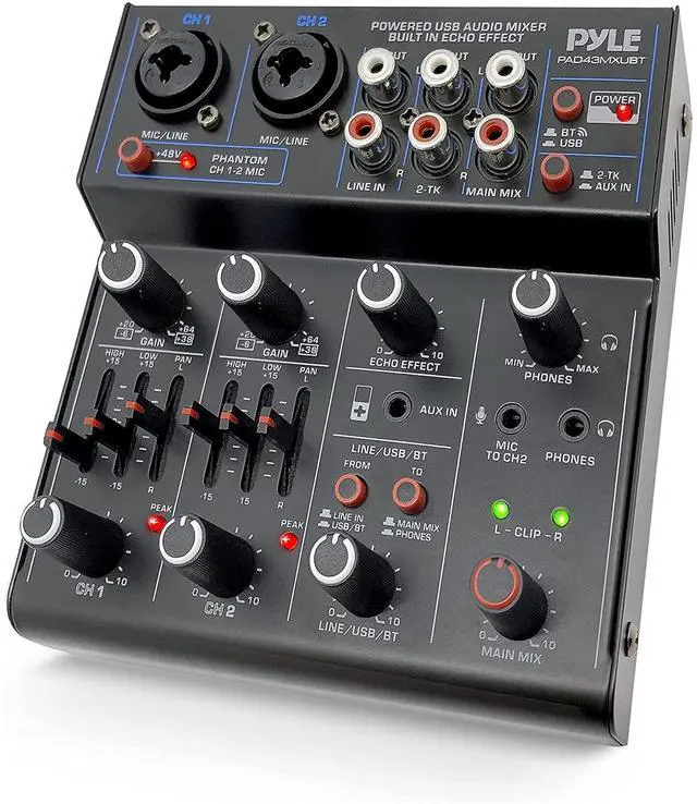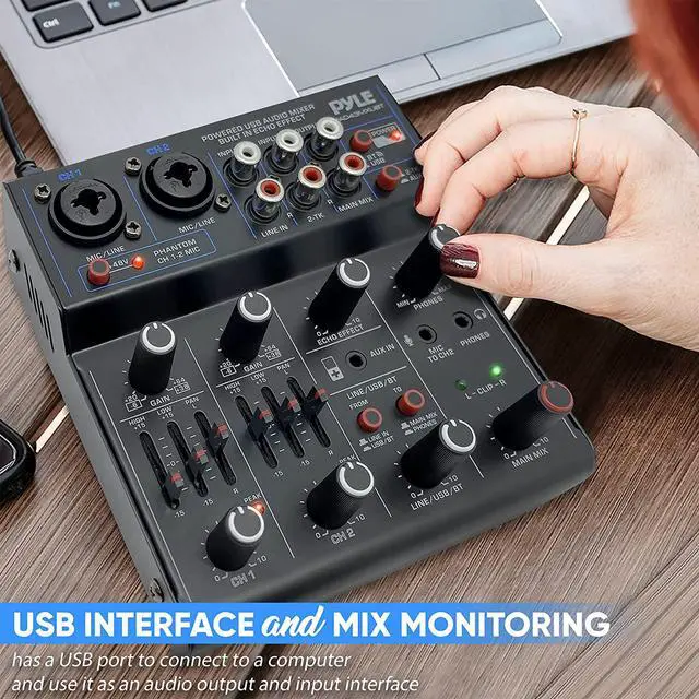 Pyle DJ mixer USB audio interface mixer is equipped w/ 2 combo jack XLR+6.35mm for mic/line/guitar inputs, 2-TK, Stereo RCA in, AUX, and 3.5mm microphone input to CH2. Produce creative remix which is perfect for DJ party/music recording