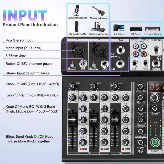 • 8 Channels Input The DJ Mixing Console is great for multiple devices connectivity.1/2/7/8Channel use XLR and 1/4 Inch jack (6.35mm) Lines input jack to connect mics or guitar, 3/4/5/6 Channel Is Stereo 1/4 Inch (6.35mm) Jack.3/5 is the stereo left channel, 4/6 is the stereo right channel, and 1 pair RCA stereo inputs to connect CD plays/keyboard/computer and 1 pair RCA ouput,Plus 1 pair 1/4" Main output to connect Speakers/Power Amplifier ect.