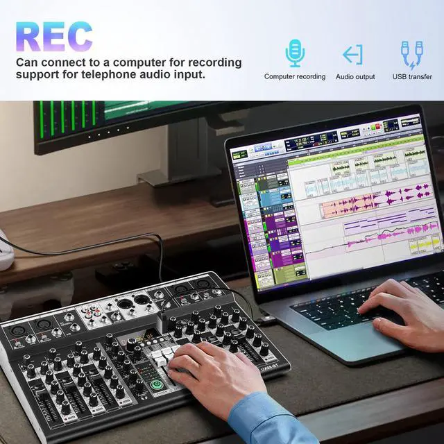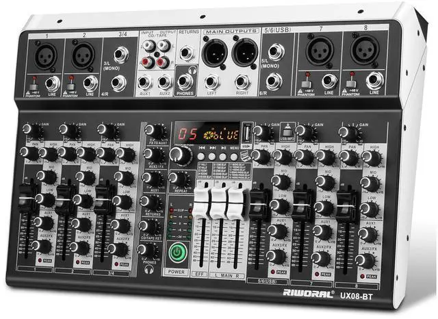 • Music Mixer BoardThe 8-channel Bluetooth mixer, built-in wireless Bluetooth, 16 DSP reverberation effect, 3-band equalization adjustment, support U disk playback function. Digital display U disk player with 48V phantom power for condenser microphones.Reminder: We are eager to know what function the customer wants to use. Any operation error may cause the device to have no sound. Welcome to email us.
