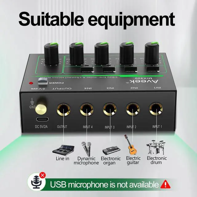 The audio mixer is compatible with a wired and wireless dynamic microphone.48V Microphones(USB microphones or condenser microphones) are not supported, so please be aware when making a purchase.