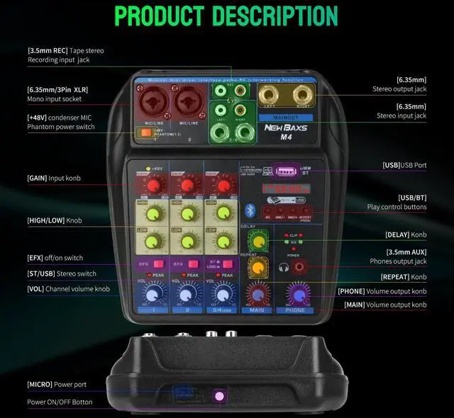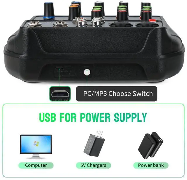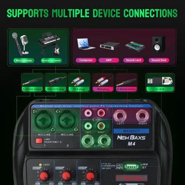 NOTE: You need to connect the front-end equipment, such as microphones, mixers, guitars, etc., and then connet the back-end equipment such as amplifiers and speakers to avoid noise or damage to the machine.