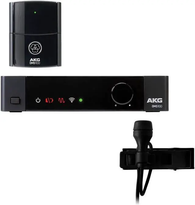 AKG is a streamlined digital wireless instrument system offering 24-bit/48 kHz uncompressed audio, AES 256-bit encryption, extended battery life, and an easy-to-use setup. It can be used with guitar, bass, or keyboard instruments for a wide variety of live stage, theater, and rehearsal applications in small music venues, wedding halls, houses of worship, and event spaces. The system includes a 1/4" to TA3F instrument cable and a lightweight bodypack transmitter that will operate for up to 12 hours on two AA batteries. The TA3M connector on the transmitter can also accommodate a wide variety of AKG lavalier and headset mics (available separately) for performers and presenters. The DMS100 uses a preset selection of four color-coded frequencies in the 2.4 GHz range, allowing you to choose the clearest channel for transmission and leaving the remaining ones available for use with up to three additional systems (available separately). The tabletop receiver offers a range of up to 100' and provides XLR and 1/4" outputs to connect to a mixer or PA system. A universal AC power adapter and two AA batteries are included. A rackmounting kit for the receiver is available separately. Bundle with AKG LC617 MD Lapel Microphone with Tie Clip (Black).