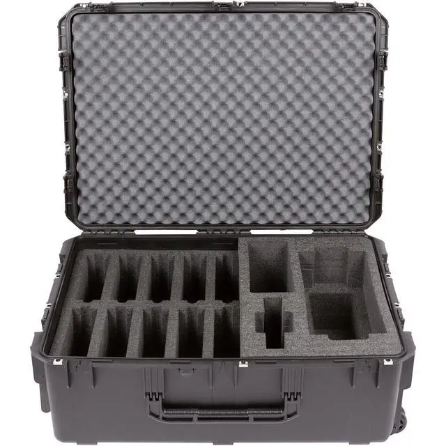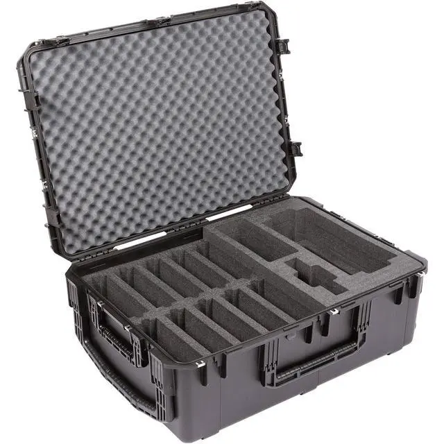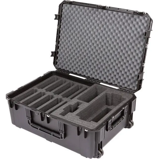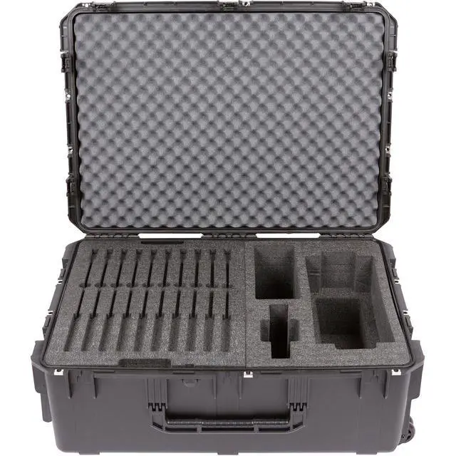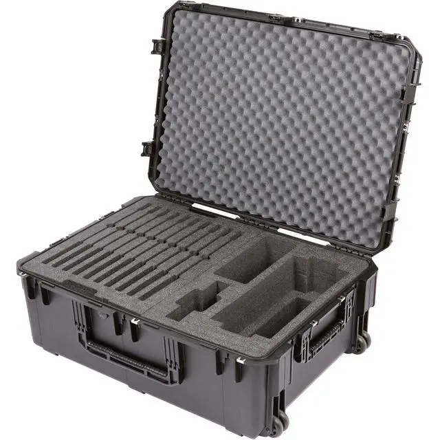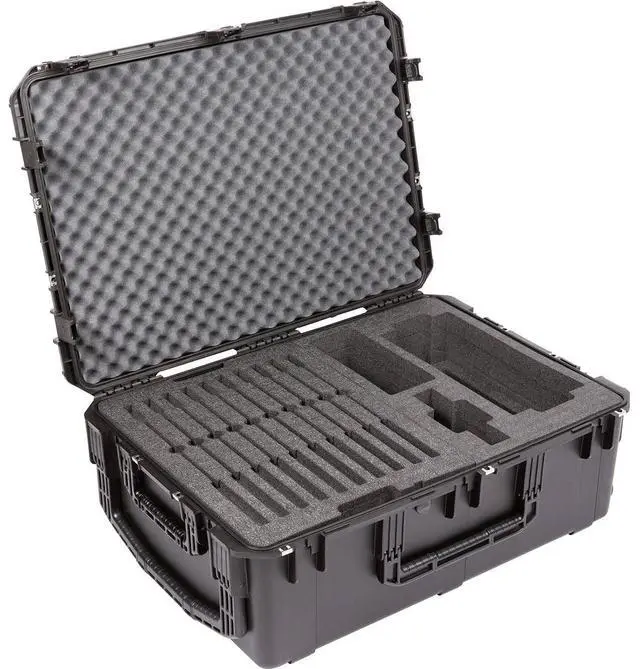After careful design and engineering, the iSeries 3i-342412 Wheeled Watertight Hard Case for Shure Microflex Wireless System emerges as an ideal solution for mobile conference rooms and event setups. This robust case is meticulously crafted to store, lock, and protect your valuable audio equipment after use. The case boasts a two-layered high-quality PE foam interior, specifically designed to safeguard the Shure Microflex wireless system. The top layer comfortably houses 10 MXC420/C or MXC420DF/C microphones, while the right side is dedicated to 1 MXCWAPT Access Point Transceiver and 1 MXCWNCS Network Charging Station.