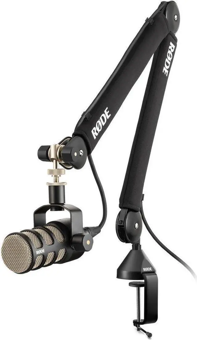 Rode PSA1+ pro studio arm Kit. This two-section boom arm rotates a full 360 degrees and features a maximum reach of 37" horizontal and 34" vertical, ensuring you'll always be able to put the mic in the perfect spot while expending minimal effort. Whether attached to a table via the supplied C-clamp or installed in a surface using the included threaded desk insert, the PSA1+ can support microphones weighing up to 2.7 pounds; even large broadcast mics are no problem for the PSA1+ arm. It comes with a 3/8 to 5/8" adapter to allow compatibility with most microphones and shockmounts on the market, and it boasts integrated cable management that'll keep your existing USB or XLR cable from becoming an unruly and unsightly mess.