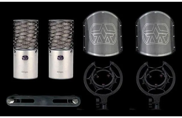 Winning multiple awards for its sound and special physical design, the Aston Origin, presented here in a stereo pair, is a large-diaphragm cardioid condenser microphone that boasts a sonic signature developed in cooperation with a panel of industry professionals and built-in elements that obviate the need for bulky accessories such as mounts and pop filters. Not only is it tonally versatile enough to use with most instruments and vocals, but it's also tough enough to take abuse and spring back to life. Plus, it has pad and high-pass filter switches to increase its flexibility even more. Inside, the mic features a 1" gold-evaporated capsule with an ambience-reducing cardioid polar pattern and high-end transformerless circuitry to ensure audio performance far outside its price point. An integral mesh-knit pop filter softens vocal plosives without coloring tone, and the stainless steel wave-form spring head simultaneously protects the capsule from knocks and enhances off-axis sound rejection. The internal shockmount system and integrated stand mount allow direct-to-stand mounting while maintaining isolation from vibration noise. Being an XLR-equipped, solid-state condenser mic, the Origin requires 48V phantom power from an XLR-connected audio interface, mic preamp, or mixer. The Origin stereo pair includes a stereo mounting bar and two SwiftShield pop filter/shockmounts.