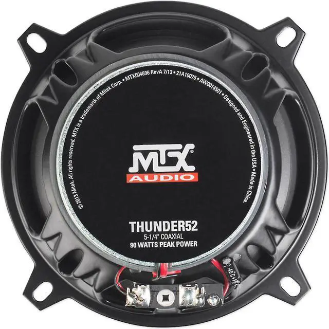 Authorized MTX Audio Dealer! Description: Rich Bass The THUNDER52 is a 5.25 2-way coaxial speaker pair that can handle up to 45-watts RMS power. THUNDER speakers are set apart from the other guys because of its ability to reproduce low frequencies that other speakers cannot reproduce. The THUNDER52 plays all the way down to 55Hz so even in systems that don't have subwoofers, you can get excellent bass response for all kinds of music. No Subwoofer Required The Thunder Coaxials offer unbeatable performance for the price in their class. They provide outstanding low frequency reproduction, easy installation, and are great as factory replacements with or without an additional amplifier. While no car speaker can produce bass like a subwoofer, these speakers truly shine in the lower frequencies. The THUNDER Series Coaxial offers it all. You will have incredibly clear response with the built-in tweeter, and plenty of Low THUNDER response from this speaker's Polypropylene cone. The rubber surround will shrug off the weather and wear that come with living in your car full-time. Audio Imaging The THUNDER52 uses a polypropylene woofer that is incredibly durable and a 15 degree pivoting tweeter to assist in obtaining the best imaging based on install location. The speakers concave cone design also assists in delivering exceptional imaging especially when speakers are mounted in the doors of a vehicle. This model includes a high temperature 4O voice coil and incorporates Spider Plateau Venting to ensure cool air is targeting the voice coil ensuring reliability over time. Features: Pair MTX THUNDER52 5.25 180 Watt 2-Way Coaxial Car Speakers RMS Power Handling: 45 Watts (Per Speaker) Peak Power Handling: 90 Watts (Per Speaker) Frequency Response: 55Hz - 20kHz Sensitivity: 92 dB Cone Material: Polypropylene Woofer Mounting Depth: 2.25 inches Extended Low Frequency Reproduction - Allows the speaker to deliver a Bigger, Fuller Sound Concave Cone Design: Produces Improved Off-Axis Response Pivoting Tweeter: To allow for Improved Imaging in Any Installation Location the Tweeter can Pivot 15° in Any Direction. Click here for the Installation Guide
