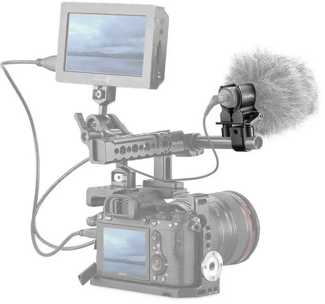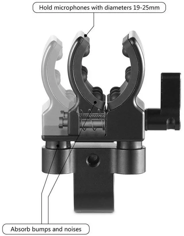 SmallRig Universal Shotgun Microphone Mount 1993B holds microphones with diameter from 19mm to 25mm. By adjusting the knob, it can grip mics of different sizes firmly. Fixed to the camera by the 15mm rod clamp, this mount is very convenient to use. For example, it can be attached to SmallRig Top Handle 2027 and Heavy Duty Handle 1979. It is equipped with soft elastic material in the microphone clamp and between the two parts, which absorb bumps and noises when you shoot run-and-gun.