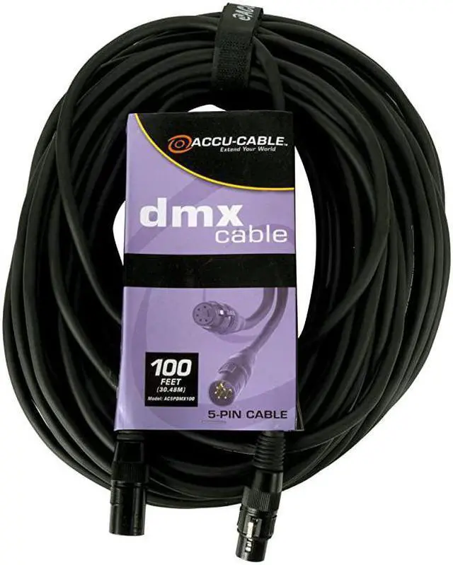Size: 100' Accu Cable DMX Stage and Set cables will allow you to connect Par Can, Movable Head Fixtures, Lasers, and other lighting affect essentials all to your DMX Control Board or DMX GO device. Professional and durable construction create a cord that is safe and reliable. Design a memorable, state-of-the-art lighting effect show at your next event with and Accu Cable. Perfect for novice or expert set designs and stage lighting applications.