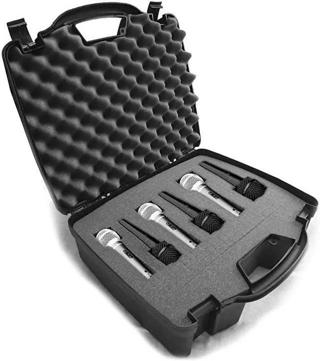 ***** *****Rugged Shure Case Protects against Impacts, Drops, Dust and Dings. Padded Dense Foam Interior is ideal for storing your Shure Condenser Microphone, Shure Cable and Accessories*****The Shure Dynamic Microphone Case has a hard exterior made of durable composite blow-mold plastic, while the internal Tri-Layer foam cushioning with diced foam customizable layer for individual compartments can be made to fit up to Six Shure Microphones, or a multitude of Musical Recording Equipment of your choosing. *****Recording Equipment Case has a thick plastic handle for easy carrying, double latch locking joints and a slot for accommodating a padlock for added theft prevention of your valuable Shure Foam Case*****Fits Shure Microphones and Accessories with