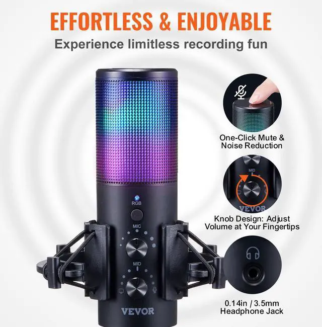 Simplicity at Its Best: Our podcast microphone is designed with simplicity in mind. No complex controls or confusing settings. The easy-to-reach top button for mute and noise reduction, along with three adjustable knobs for controlling lighting modes, microphone volume, and real-time monitoring balance, even beginners can effortlessly use it. Just follow the detailed user manual, and you'll be in control without any hassle.