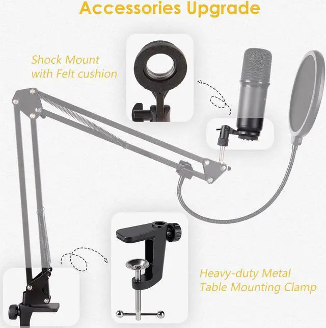 Intimate upgrade of materials - Studio USB Microphone with sturdy and durable broadcast suspension boom scissor arm is made out of all-aluminum construction. 1-The microphone shell is more sturdy and the appearance is more advanced appearance. 2-Upgraded table clamp base to Integrated that is firmer and can attach to tables and counters. 3-The shock mount adds a layer of felt to prevent friction, which can give the microphone better protection and support