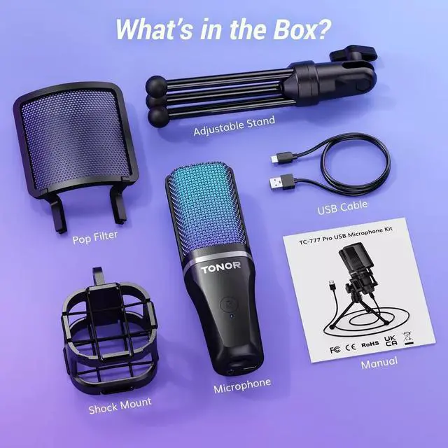 What's Included: 1 x Microphone with Power Cord( 1.5 m), 1 x Foldable Mic Tripod, 1 x Mini Shock Mount, 1x Foam Windcreen, 1 x Pop Filter and 1 x Manual.