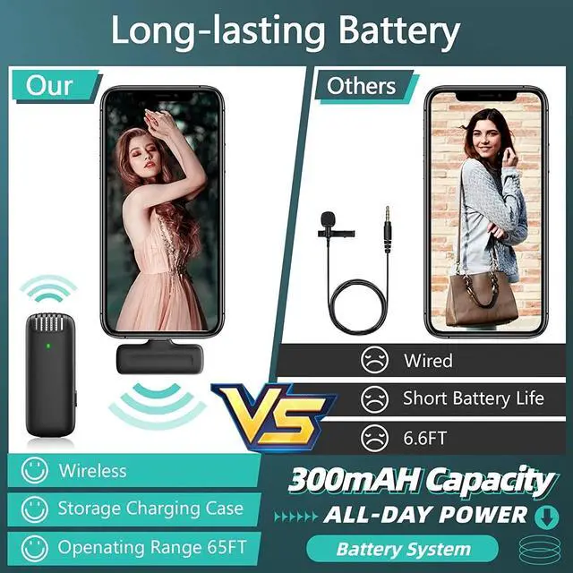 Long Working Time & Easy to Carry Our wireless lavalier microphone built-in 80mAh battery can work 5-6 hours after a full charge, the included 300mAh charging case can charge the mic at least 3-4 times, supporting 2-3 days of use, without worrying about running out of power and stopping the recording work. In addition, the mini design is more convenient to carry and save.