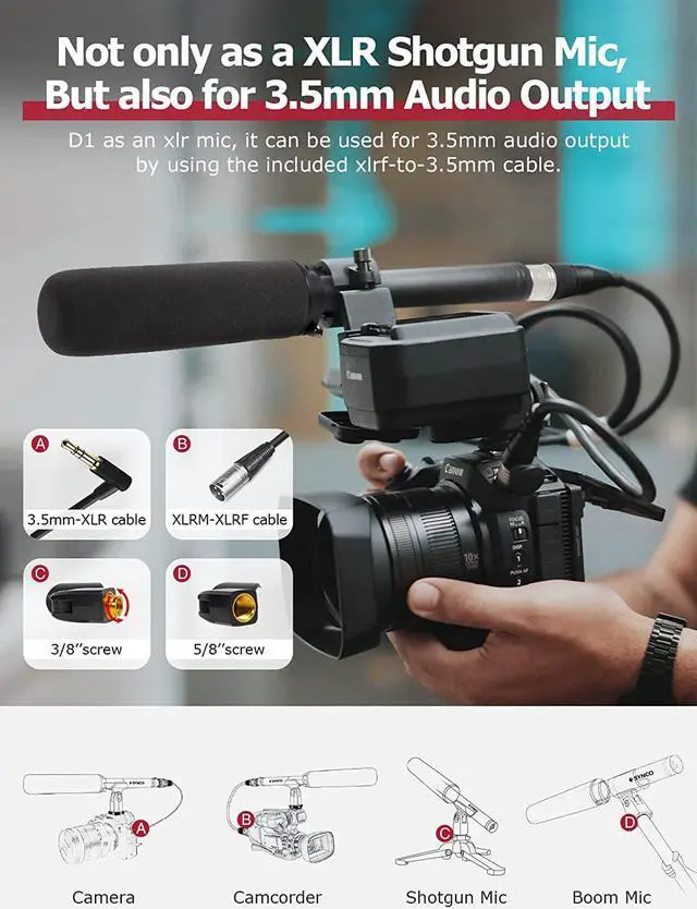 Multiple Mounting PositionThe 11.22 inches length of shotgun condenser mic is well suited for ENG, outdoor recording, and camera mounting. A 3/8 to 5/8 mic holder for easy placement on a boom pole or tripod. Through XLRM-XLRF cable and 3.5 mm-XLR cable, the Mic-D1 can connect to cameras, camcorders and mixer board etc.