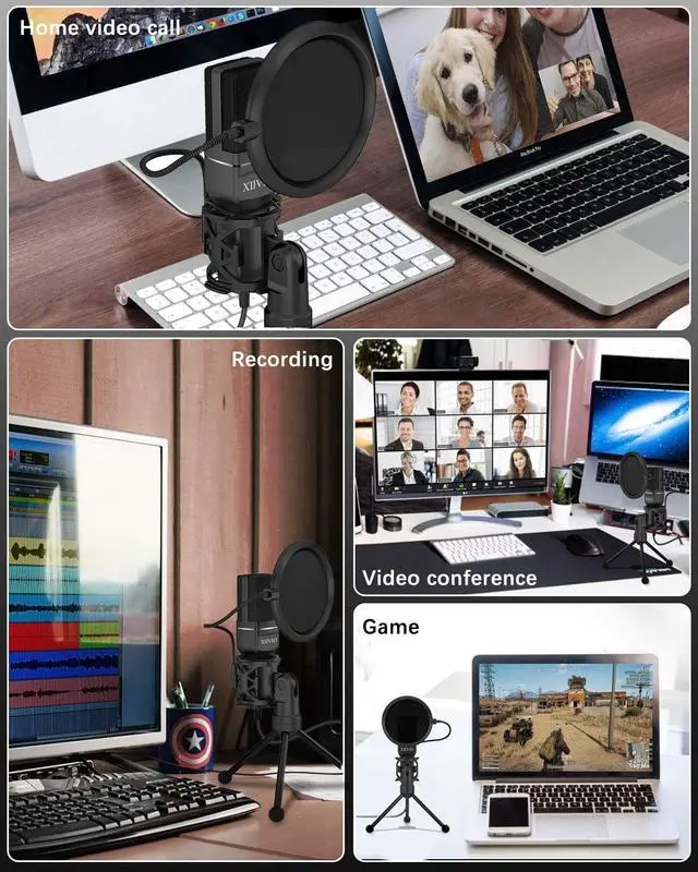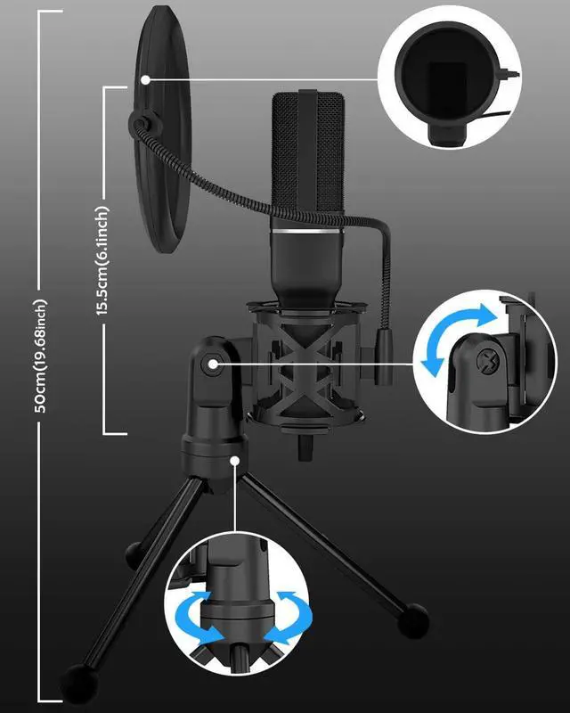 USB Mic Quality AccessoriesThe usb microphone with USB Cable lengths up to 1.5 m with no loss! This pc microphone stand features a 3-legged base that retracts and folds up easily for convenient storage and portable; The double nylon net microphone wind screen pop filter helps you against plosion and popping to get your best vocal recordings. 360-degree flexible gooseneck provides adjustment of any angle or position as you want to best fit your needs for your lovely voice.