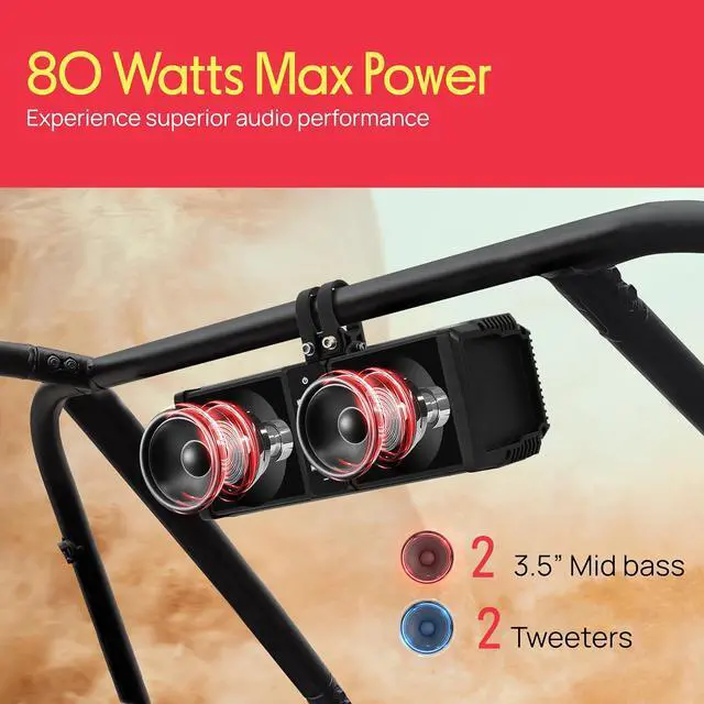 HIGH-POWERED UTV SOUND SYSTEM - This utv sound bar delivers 80W peak power with its Class D amplifier. Enjoy hi-fi audio through 3.5 mid-bass drivers and 1 dome tweeters. Forward-facing design maximizes SPL and wide sound staging for rugged rides