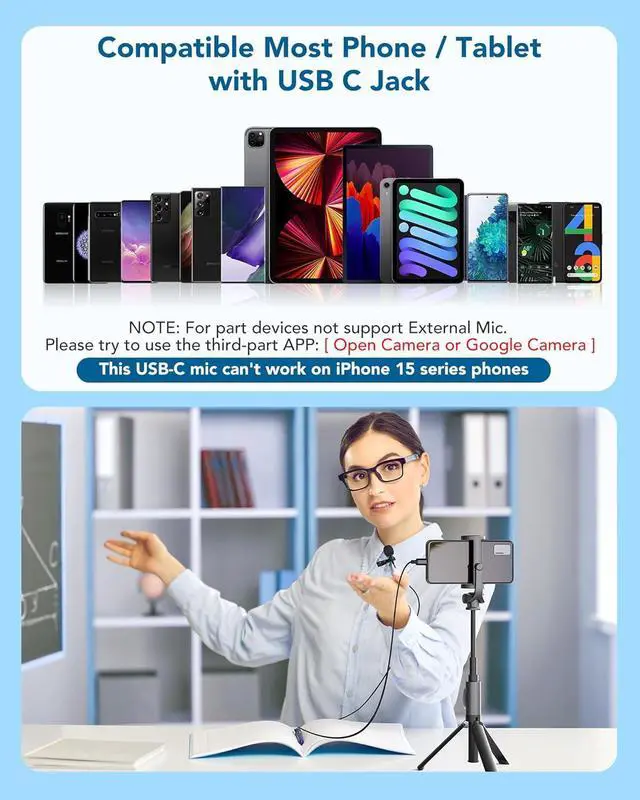 - Just plug the mic into your Mobile phone or other device with USB C connector and start recording.