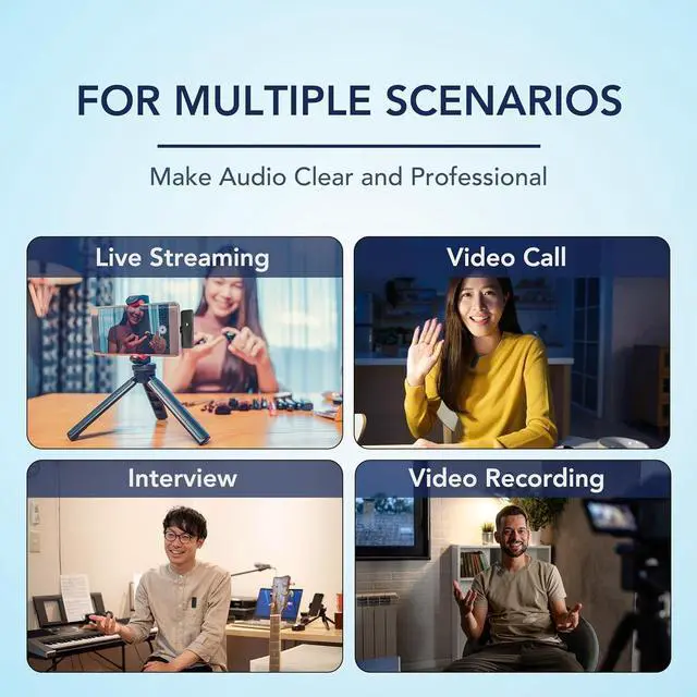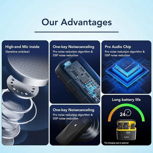 The wireless microphone adopts a unique streamlined waistline design. The dark color is overall square and tough, calm and delicate. It is equipped with a compact magnetic charging box and an intuitive power display. 360-degree omnidirectional, professional condenser noise reduction microphone is suitable for a variety of scenarios, such as video recording, live streaming, interviews, Vlogging, YouTube, TikTok.