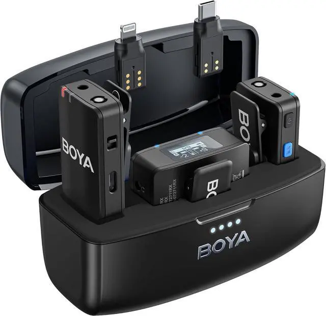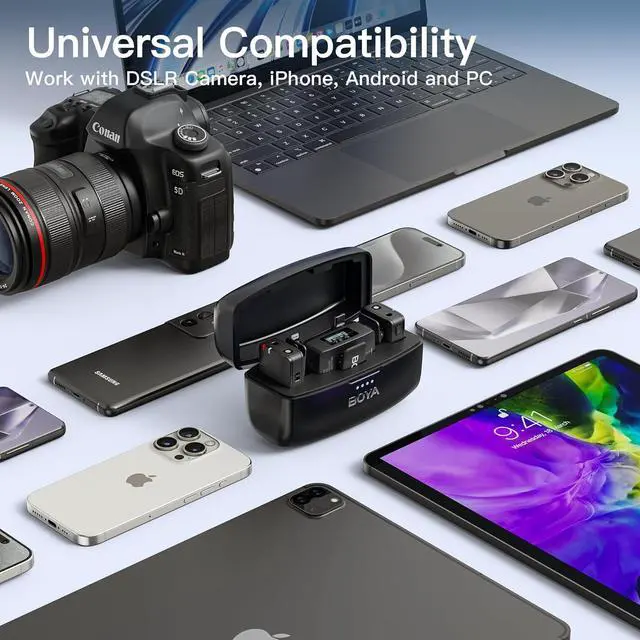 It is possible to use BOYAMIC in many ways. You can use the transmitter with the 3.5 mm external microphone, your line input devices, or its built-in microphone as your needs. A 3.5 mm TRS output, USB-C, and iOS Lightning adapters allow the receiver to connect with cameras, mixers, smartphones, tablets, laptops, and more.