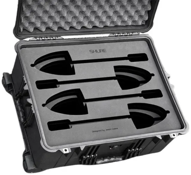 It is essential to protect your valuable audio equipment, and the Jason Cases Waterproof Wheeled Hard Case with Laser-Cut Foam is expertly designed to do just that for your Shure MX418 microphones. This robust case features a custom-cut foam insert, meticulously laser-cut to cradle four MX418 microphones, each with its own desktop base, ensuring maximum protection during transport and storage. The precision of the foam insert not only safeguards your microphones from damage but also keeps them organized and easily accessible.