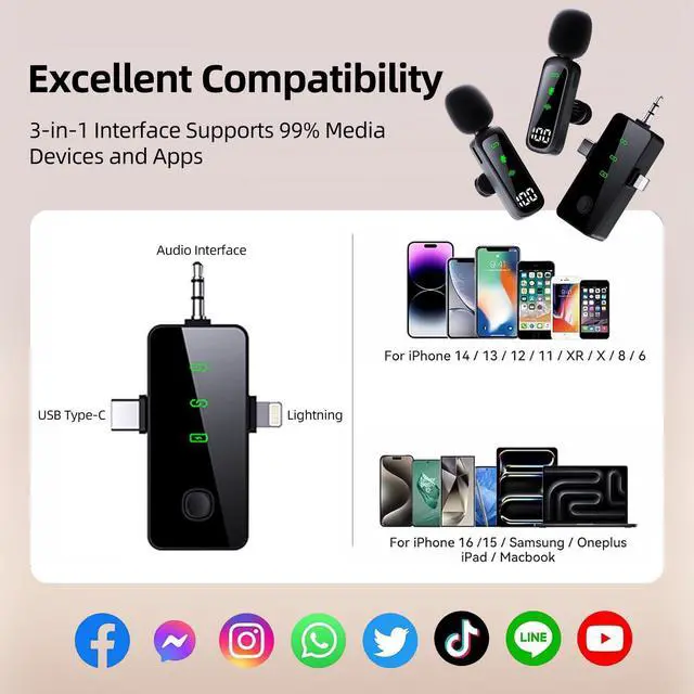| Included Components | 1 × Microphone Charging Cable, 1 × Microphones Manual, 1 × Mini Microphone 3 - in - 1 Universal Receiver, 2 × Wireless Lavalier Microphone Transmitter |