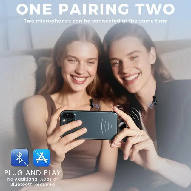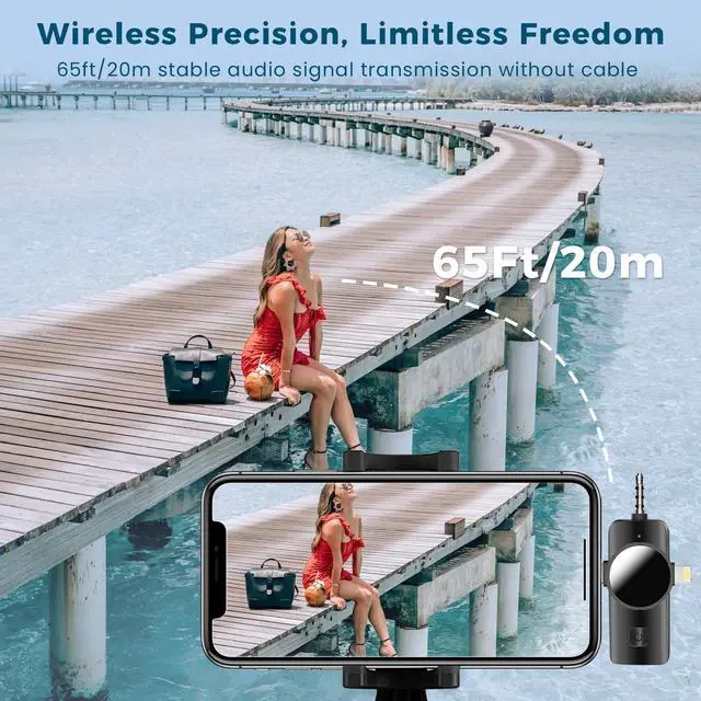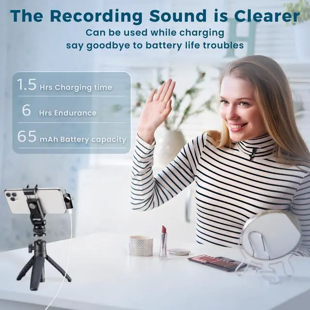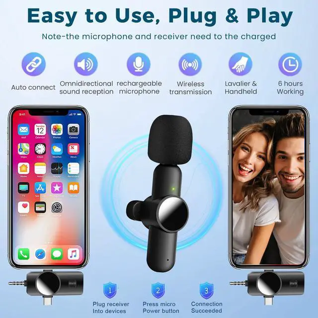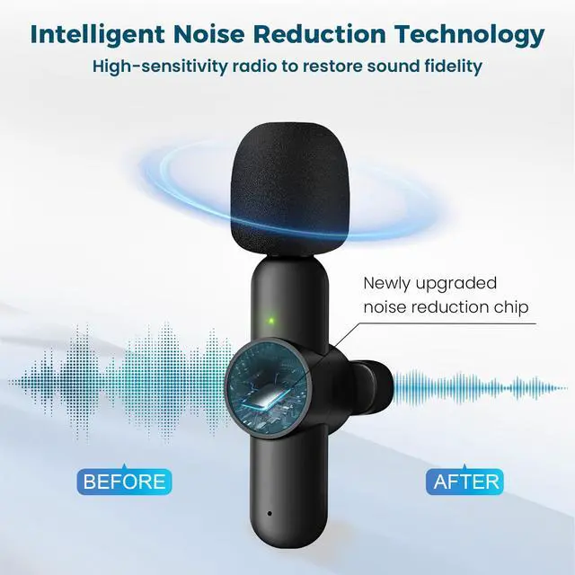 Clear Sound Quality:This innovative wireless lavalier microphone equipped with an advanced DSP chip, providing effective identification of the original sound and clear recording in noisy environments. Equipped with 2 plush windproof covers and 2pcs replacement Sponge heads reduces wind noise and plosives, while the AI algorithm intelligent noise reduction module accurately filters all kinds of noise and has strong anti-interference ability.microphone wireless.