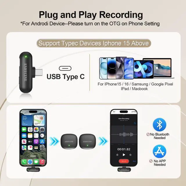 [USB-C Plug and Play] The andycine USB-C MC wireless lavalier microphone plug and play do not need any App,Bluetooth,WIFI paring. Insert the receiver dongle on your phone, the two TX will automatically paring indicator shows green color and start recording voices.The 50meter transmission range suitable for your Vlog video recording, live streaming,interviewing,online meeting,online educations.