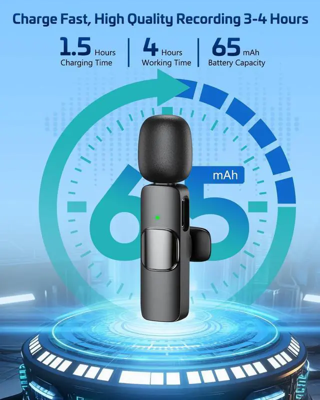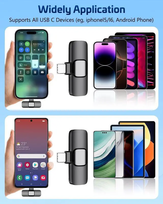 Universal Wireless Mic for All Devices Works seamlessly with iPhone (Lightning or Type-C), Android (Type-C). This tiny wireless microphone comes with all necessary adapters - Just plug and record instantly.