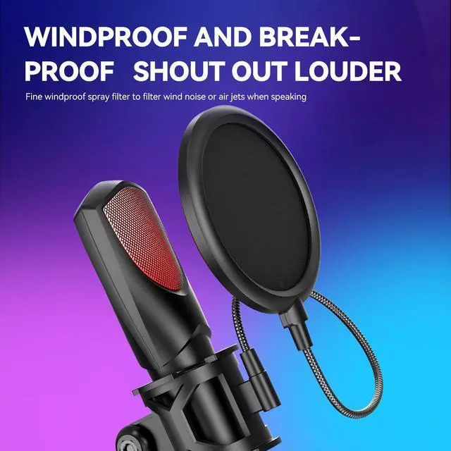 Cool RGB Lighting & Complete Accessory Kit This professional microphone features patented cool RGB lighting to create a dynamic atmosphere. It comes with a popular pop filter mount that effectively reduces plosive sounds, delivering purer recordings right out of the box