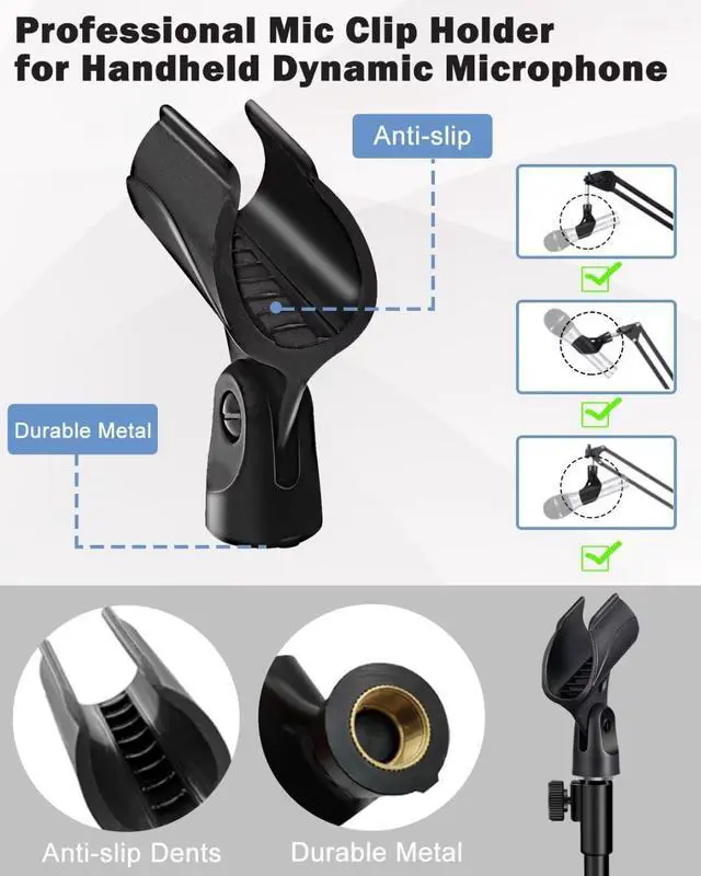Suitable for dynamic microphone - Microphone clip with anti-slip and fixed function for all handheld microphone, compatible with ATR2100-USB, AT2005-USB, Q2U, Xm8500, SM58, PGA48/PGA58 and other dynamic microphones.