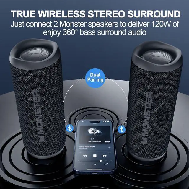 True Wireless Speaker True wireless stereo speaker supports Bluetooth 5.4, allowing you to easily pair two portable speakers and instantly upgrade to 120W of stereo surround sound. It delivers true 360° dualenhanced stereo, making it perfect for parties or for relaxing at home while enjoying highquality music.