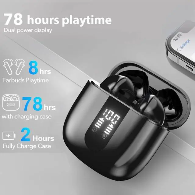 Intelligent LED DisplayPremium LED digital battery display shows remaining power at a glance. 60 Hours long Battery LifeWith an energy-saving design, the earbuds can last for 6-7 hours on a full charge and up to 60 hours when used with the charging case at 60% volume. Ultra-fast Type-C Charging10 minutes of charging provides 1 hour of usage.