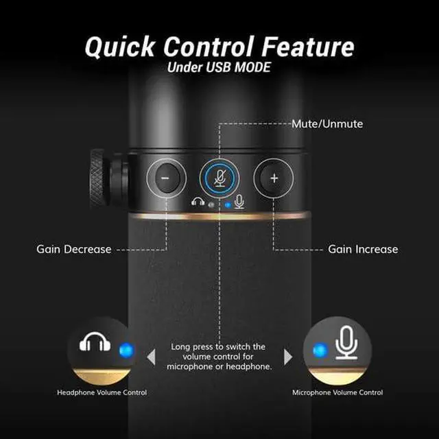 Yes, it does. Under USB mode, pressing the mute button to mute. And, the +/- buttons can adjust the mic's volume. By long-pressing the mute button, it switched to the headphone volume adjustment.
