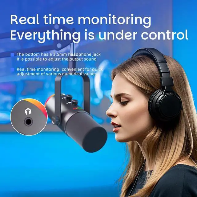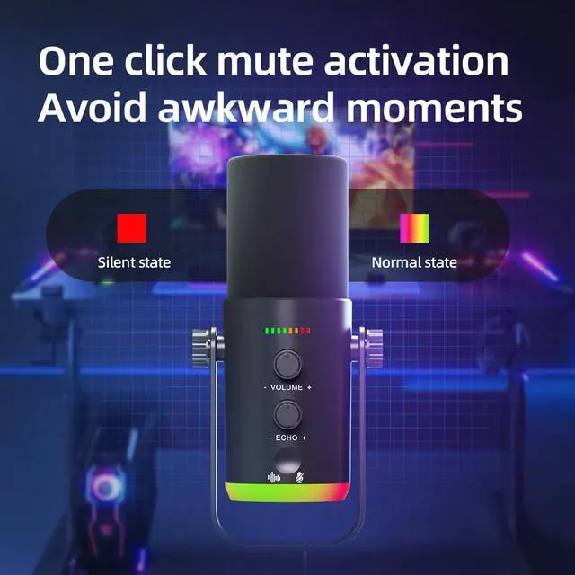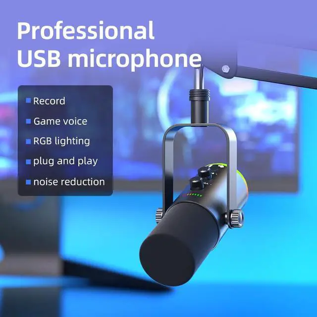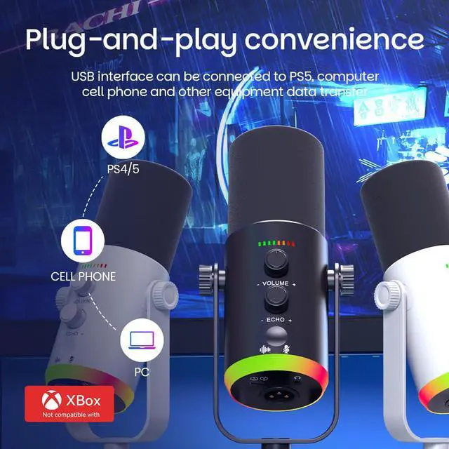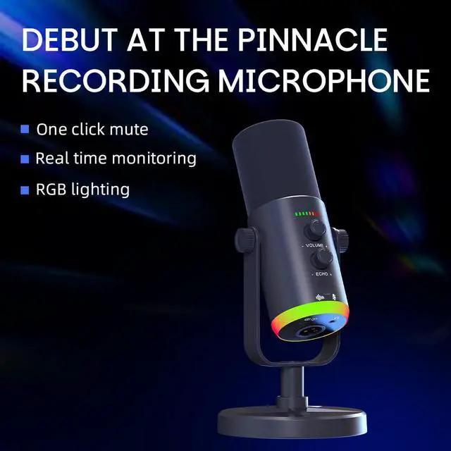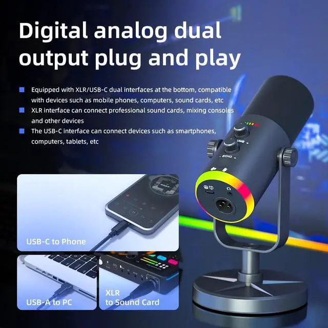 USB/XLR Desktop Dynamic Microphone with RGB Lighting, Noise Reduction, Mute Button & Headphone Jack - Podcast, Gaming, Streaming Mic for PC & Computer (Black)