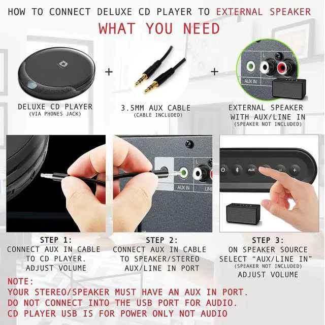 The Deluxe Personal CD Player is the perfect Mini CD Player you will ever need! Listen to your favourite CD Audiobooks! Play your favourite CD while driving in your Car or while you work out! (Aux in Cable Included) The 60 Second Anti Skip will ensure your CD does not skip while you are on the move! Connect to your favourite Speaker or Boombox! (Aux Cable included)
