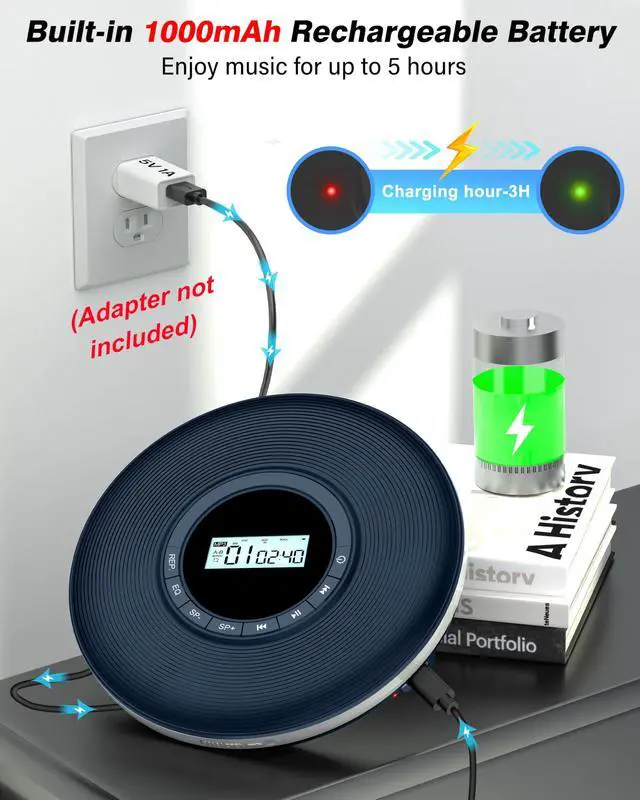 CD Player with Rechargeable Battery Inspired by the disman cd player of the past, our new and improved portable cd player uses modern technology to bring classic hardware into the modern era. Our personal cd player are compatible with standard CD/CD-R/CD-RW discs, MP3 CD discs. This cd player equips with a built-in 1000mAh rechargeable battery, eliminating the hassle of traditional dry cell batteries and delivering a stable playback experience for you.
