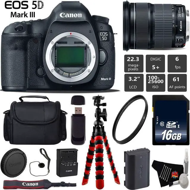 The Canon EOS 5D Mark III DSLR Camera is a full-frame 22.3MP DSLR featuring exceptional still image and movie recording capabilities. Integrating Canon's new DIGIC 5+ Image Processor and 14-bit A/D conversion, this camera is able to produce superbly detailed imagery with immense low-light sensitivity that is further aided by an extended ISO range up to 102400.