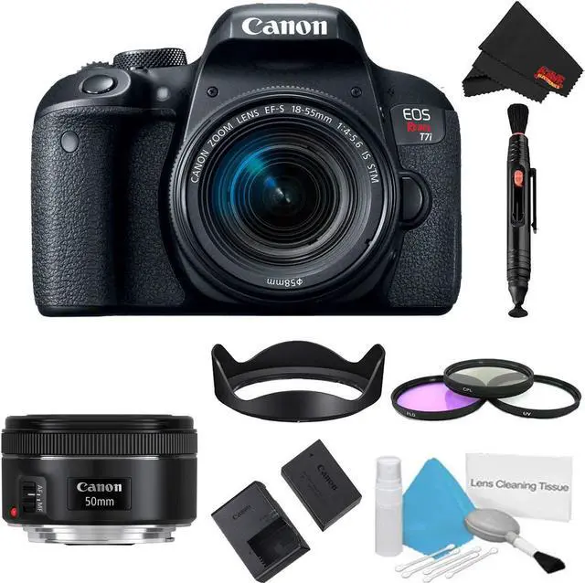 Packing a versatile feature-set in a sleek and portable body, the EOS Rebel T7i DSLR from Canon offers advanced imaging capabilities along with a convenient range of controls and connectivity. Utilizing a 24.2MP APS-C CMOS sensor and DIGIC 7 image processor, the Rebel T7i is able to capture high-resolution stills and video with an expanded sensitivity range of ISO 100-51200 to suit working in a wide variety of lighting conditions. The sensor and processor combination also avails 6 fps continuous shooting for working with moving subjects. Benefitting the imaging attributes, the sensor's design also facilitates Dual Pixel CMOS AF, which uses phase-detection autofocus for quick, accurate, and smooth focusing performance when recording movies or shooting stills in live view. When shooting stills using the optical viewfinder, a 45-point all cross-type phase-detection system is used for quick and accurate focusing in a variety of shooting scenarios.